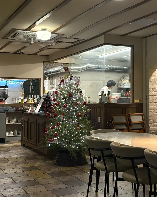 주문을 마치고 레스토랑 내부를 둘러보았다. 오픈 키친에서는 셰프들이 분주하게 움직이고 있었다. 활활 타오르는 화덕에서 피자가 구워지는 모습은 그 자체로 하나의 볼거리였다. 사진 속에서 보이는 것처럼, 크리스마스 시즌에는 커다란 트리 장식이 더해져 더욱 따뜻한 분위기를 자아낸다고 한다.