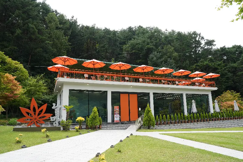 카페 입구에 들어서자, 은은한 커피 향과 따뜻한 분위기가 나를 맞이했다. 높은 천장과 넓은 창문 덕분에 실내는 탁 트인 느낌이었고, 햇살이 가득 들어와 아늑함을 더했다. 에서 보이는 것처럼 통유리창 너머로는 아름다운 자연 풍경이 한눈에 들어왔다. 마치 그림 액자를 걸어놓은 듯, 초록빛 나무들과 형형색색의 단풍이 어우러진 풍경은 그 자체로 훌륭한 예술 작품이었다.