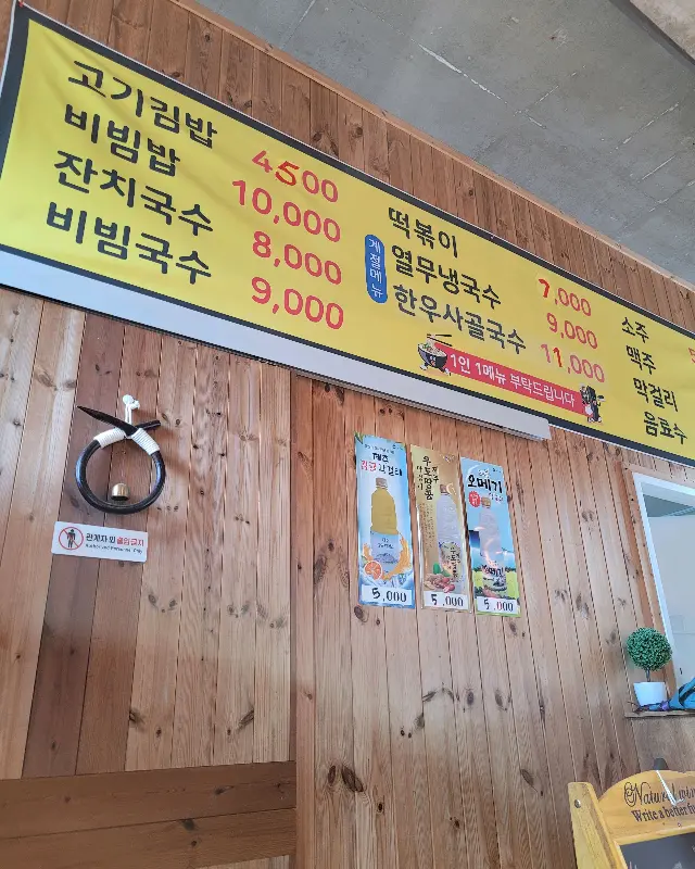 문을 열고 들어서자, 정갈하게 정돈된 테이블과 은은하게 풍기는 멸치 육수 향이 편안함을 안겨주었다. 나무로 된 벽면에는 메뉴가 정갈하게 적혀 있었는데, 고기김밥, 비빔밥, 잔치국수, 비빔국수 등 친근한 메뉴들이 눈에 띄었다. 메뉴판 옆에는 앙증맞은 그림이 그려진 안내문과 아기자기한 소품들이 놓여 있어, 이곳을 운영하는 부부의 따뜻한 마음이 느껴졌다.