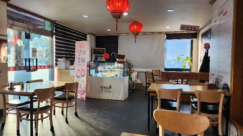 횡천루는 겉으로 보기에는 평범한 중국집이지만, 이곳을 찾는 사람들의 발길은 끊이지 않습니다. 붉은색 간판에 용 그림이 그려진 외관은 어딘가 모르게 정겹고 친근한 느낌을 줍니다. 매장 앞에 걸린 현수막에는 ‘메생이 굴짬뽕’이라는 문구가 적혀 있어, 계절 메뉴에 대한 기대감을 높입니다. 밝은 햇살이 가득 들어오는 넓고 깔끔한 홀은 편안한 분위기를 자아냅니다. 붉은색 등불이 은은하게 빛나고, 테이블마다 놓인 포장된 수저와 젓가락에서는 깔끔함이 느껴집니다. 마치 오랜 시간 이 자리를 지켜온 듯한, 편안함과 익숙함이 느껴지는 공간입니다.