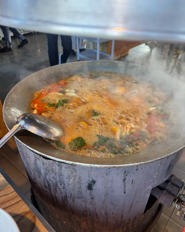 다행히 회전율이 빠른 덕분에 오래 기다리지 않고 자리에 앉을 수 있었다. 테이블마다 큼지막한 드럼통 위에 솥뚜껑이 얹어져 있는 모습이 인상적이었다. 솥뚜껑 아래에서는 뜨거운 화력이 활활 타올랐고, 그 열기에 매운탕은 쉴 새 없이 보글거리고 있었다. 마치 커다란 캔버스 위에 펼쳐진 추상화처럼, 붉은 국물과 푸른 채소, 하얀 수제비가 어우러진 모습은 그 자체로도 훌륭한 볼거리였다.