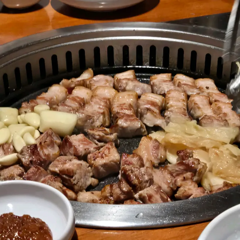 드디어 기다리고 기다리던 삼겹살이 등장했다. 선홍빛의 신선한 고기 빛깔이 보기만 해도 군침을 삼키게 했다. 83해치의 가장 큰 장점 중 하나는 직원분들이 직접 고기를 구워준다는 점이다. 덕분에 나는 편안하게 앉아서 맛있게 익어가는 고기를 바라보며, 함께 온 친구와 이야기를 나눌 수 있었다.