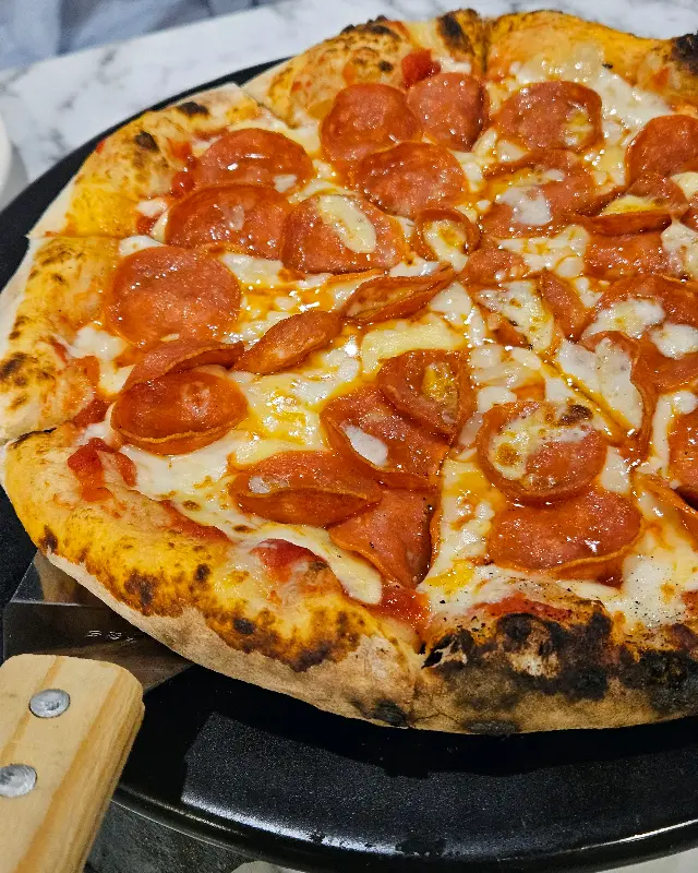 드디어 기다리고 기다리던 페퍼로니 피자가 등장했다. 윤기가 자르르 흐르는 페퍼로니가 촘촘히 박혀 있었고, 고소한 치즈 냄새가 코를 찔렀다. 갓 구워져 나온 피자는, 그 비주얼만으로도 이미 합격점을 주고 싶을 만큼 완벽했다.