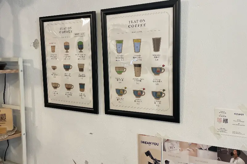 주문을 마치고 카페 내부를 천천히 둘러보았다. 한쪽 벽면에는 다양한 커피 종류를 그림으로 표현한 액자들이 걸려 있었다. 커피에 대한 전문적인 지식은 없지만, 그림들을 보고 있으니 마치 커피 박물관에 온 듯한 기분이 들었다. 사장님의 커피에 대한 열정과 자부심이 느껴지는 공간이었다.
