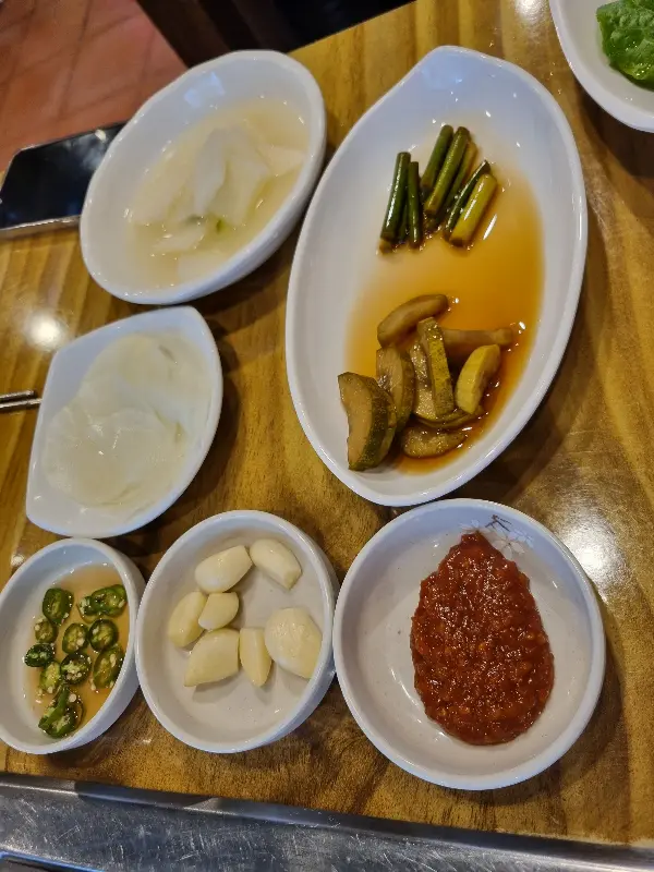 주문 후 얼마 지나지 않아, 테이블 위로 밑반찬들이 하나 둘씩 놓이기 시작했다. 윤기가 자르르 흐르는 겉절이 김치, 새콤달콤한 양파절임, 아삭한 콩나물무침 등 정갈하게 담긴 반찬들이 보기만 해도 입맛을 돋웠다. 특히, 쌈 채소는 신선함이 남달랐다. 싱싱한 쌈 채소를 보니, 고기를 얼른 구워 싸 먹고 싶다는 생각이 간절해졌다. 잠시 후, 숯불이 들어오고, 드디어 기다리고 기다리던 양념갈매기가 등장했다.