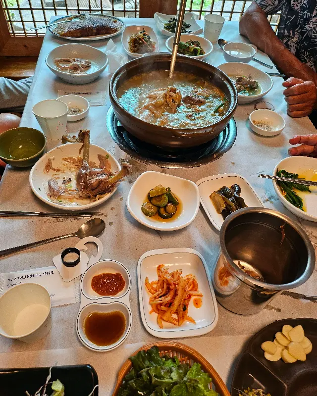 오향오리를 맛보고 감탄하고 있을 때, 능이백숙이 커다란 뚝배기에 담겨 나왔다. 뽀얀 국물 위에는 능이버섯이 듬뿍 올려져 있었고, 뚝배기 안에서는 닭고기와 각종 채소들이 보글보글 끓고 있었다. 국물을 한 입 맛보니, 깊고 진한 능이 향이 입안 가득 퍼져 나갔다. 닭고기는 어찌나 부드러운지, 젓가락으로 살짝만 건드려도 살이 발라졌다. 푹 익은 닭고기를 능이버섯과 함께 먹으니, 입안에서 사르르 녹는 듯했다. 특히 능이 특유의 향긋함이 닭고기의 풍미를 더욱 끌어올렸다. 뜨끈한 국물을 마시니, 온몸이 따뜻해지는 기분이었다. 마치 몸 속 깊은 곳까지 건강해지는 느낌이랄까.