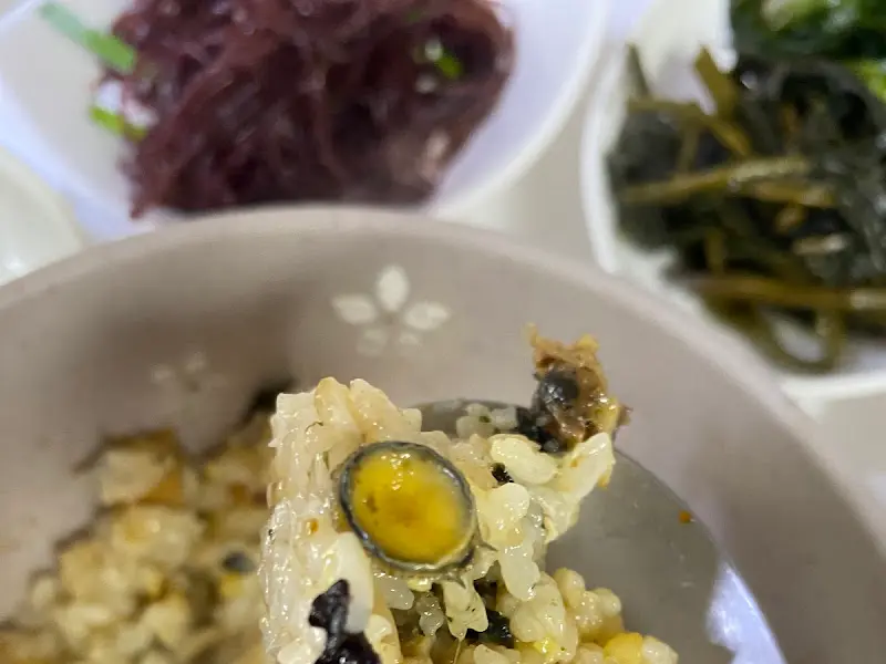 따개비밥 또한 기대 이상이었다. 따개비는 잘게 다져져 밥알 사이사이에 숨어 있었는데, 씹을 때마다 톡톡 터지는 식감이 재미있었다. 따개비 특유의 쌉쌀하면서도 고소한 맛은 갓 지은 밥과 어우러져 환상적인 조화를 이루었다. 따개비밥에 김가루를 솔솔 뿌려 먹으니, 고소한 맛이 한층 더 깊어졌다. 이미지 속 따개비밥처럼 김을 듬뿍 올려 먹으니 바다향이 입안 가득 퍼지는 듯했다.