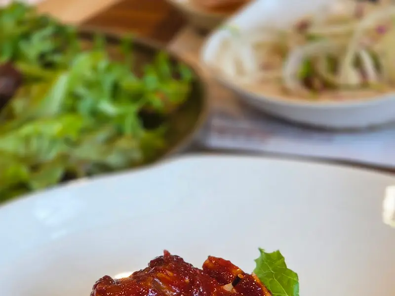 소들녘의 밑반찬들은 하나하나 정성이 가득 담겨 있었다. 신선한 야채로 만든 샐러드는 입맛을 돋우기에 충분했고, 정갈하게 담긴 겉절이는 갈비의 느끼함을 잡아주었다. 특히, 샐러드에 뿌려진 드레싱은 상큼하면서도 달콤한 맛이 일품이었는데, 마치 햇살 가득한 유럽의 어느 정원에서 맛보는 듯한 느낌을 선사했다.