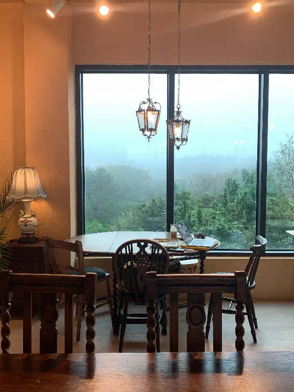 카페는 1, 2층으로 나뉘어져 있었는데, 2층은 1층과는 또 다른 분위기를 자아냈다. 2층에서는 창밖으로 펼쳐진 푸르른 숲을 감상할 수 있었다. 특히, 안개가 자욱하게 낀 날에는 몽환적인 분위기를 만끽할 수 있다고 한다. 내가 방문한 날도 안개가 짙게 껴서 더욱 특별한 경험을 할 수 있었다. 마치 구름 속에 떠 있는 듯한 기분으로 커피를 마시니, 저절로 힐링이 되는 듯했다. 사진에서 볼 수 있듯이, 2층에서 내려다보는 1층의 모습 또한 매우 인상적이었다. 높은 층고 덕분에 탁 트인 개방감을 느낄 수 있었고, 앤티크 가구들이 더욱 돋보이는 효과가 있었다.
