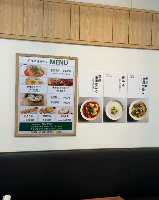 가벼운 발걸음으로 도착한 망향비빔국수 창동점은 생각보다 훨씬 넓고 쾌적했다. 넓은 테이블 간 간격 덕분에 편안하게 식사를 즐길 수 있을 것 같았다. 매장 한쪽 벽면에는 메뉴 사진들이 걸려 있었는데, 갓 버무린 듯한 붉은 비빔국수의 모습이 유혹적이었다. 보기만 해도 입안에 침이 고이는 비주얼이었다. 메뉴판을 보니 비빔국수 외에도 잔치국수, 돈까스, 만두 등 다양한 메뉴가 있었다. 하지만 나의 목표는 오직 하나, 비빔국수였다.