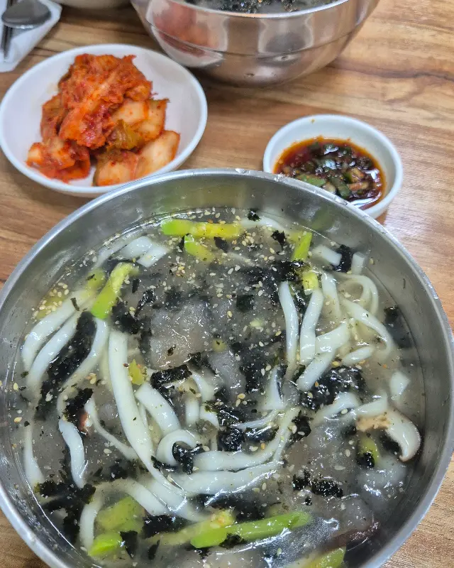 드디어 기다리고 기다리던 감자옹심이가 나왔다. 뽀얀 국물 위로 동글동글한 옹심이가 가득 떠 있었다. 김 가루와 잘게 썰린 채소가 고명으로 올려져 있어 더욱 먹음직스러워 보였다. 스테인리스 그릇에서 피어오르는 뜨거운 김이 코끝을 간지럽혔다. 숟가락으로 국물을 한 입 떠 맛보았다. 멸치 육수 특유의 시원하면서도 깊은 맛이 입안 가득 퍼졌다. 후추의 은은한 향이 느끼함을 잡아주어 더욱 깔끔하게 느껴졌다.