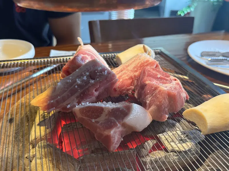 드디어 기다리고 기다리던 암퇘지 소금구이가 등장했다. 선홍빛의 두툼한 고기 위에 굵은 소금이 솔솔 뿌려진 모습이 보기만 해도 군침이 돌았다. 곧이어 뜨겁게 달궈진 숯불이 들어오고, 직원분께서 직접 고기를 구워주셨다. 지글거리는 소리와 함께 숯불 향이 코를 자극했다.