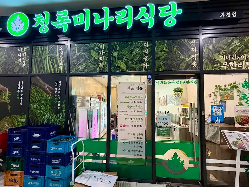 과천청사역에서 내려 5분 정도 걸으니, 멀리서도 한눈에 띄는 초록색 간판이 보였다. “청록미나리식당”이라는 간판 글씨 옆에는 싱그러운 미나리 잎이 그려져 있었다. 마치 미나리 밭 한가운데에 들어선 듯한 느낌이랄까. 매장 앞에는 싱싱한 미나리가 가득 담긴 상자들이 쌓여 있었는데, 그 모습에서부터 신선함이 느껴졌다.