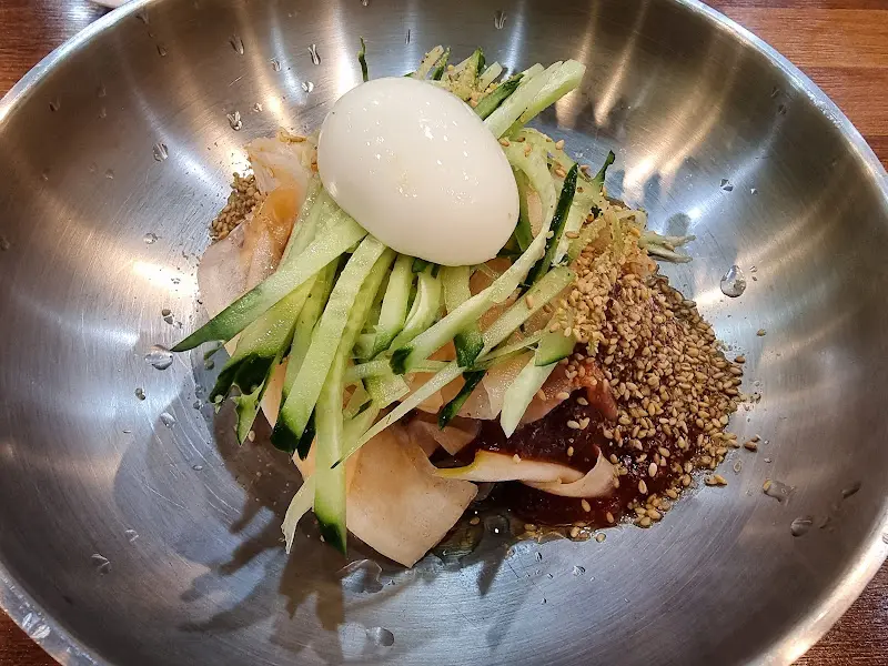 잠시 후, 기다리고 기다리던 비빔냉면이 모습을 드러냈다. 스테인리스 그릇에 담겨 나온 냉면은 보기만 해도 시원함이 느껴졌다. 붉은 양념장 위로 곱게 채 썬 오이와 삶은 계란이 얹어져 있었고, 깨가 듬뿍 뿌려져 있어 고소한 향을 풍겼다.