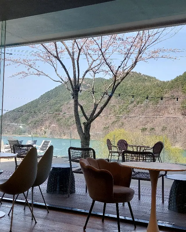 카페 문을 열고 들어서자, 모던하면서도 따뜻한 분위기가 나를 감쌌다. 높은 천장과 넓은 공간, 그리고 곳곳에 놓인 감각적인 인테리어 소품들이 눈길을 끌었다. 특히, 전면 통창 너머로 펼쳐지는 저수지 뷰는 그야말로 장관이었다. 마치 한 폭의 그림처럼 잔잔하게 빛나는 물결과 푸르른 산세가 어우러져, 보는 것만으로도 마음이 평온해지는 느낌이었다. 에서 보이는 것처럼, 나무 소재와 간결한 조명이 조화롭게 어우러진 카운터는 세련된 느낌을 더했다.