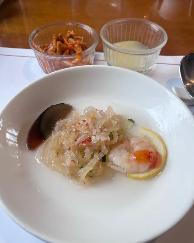 가장 먼저 이품냉채가 나왔다. 얇게 슬라이스 된 오이와 해파리, 새우, 피단이 조화롭게 담겨 있었다. 톡 쏘는 겨자 소스가 입맛을 돋우며 식사의 시작을 알렸다. 꼬들꼬들한 해파리의 식감과 신선한 채소의 아삭함이 어우러져 정말 맛있었다. 특히, 피단의 톡 쏘는 풍미가 냉채의 맛을 한층 더 깊게 만들어주는 듯했다.