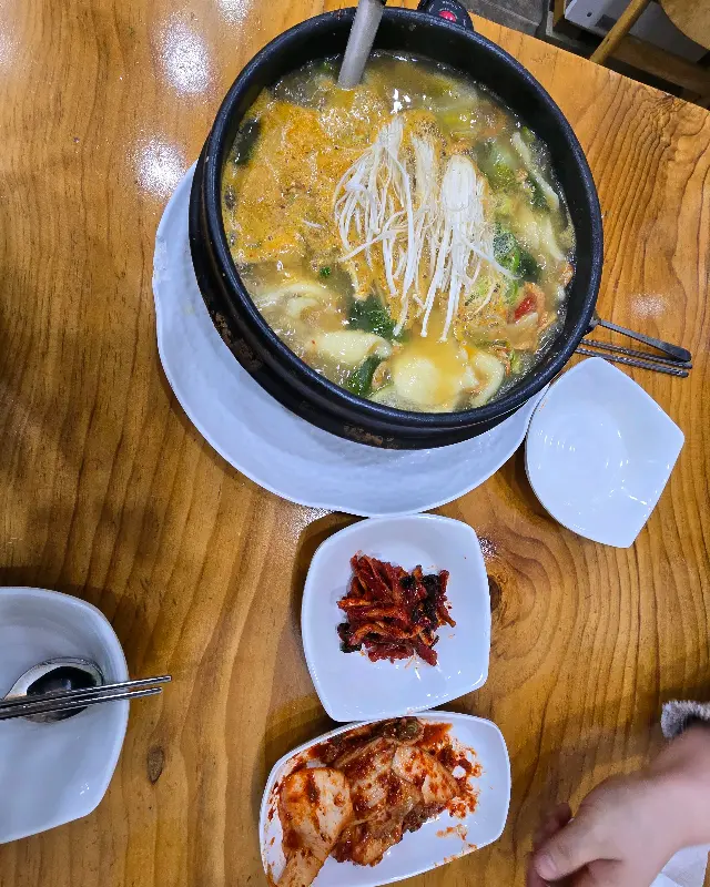 드디어 기다리고 기다리던 털레기 수제비가 등장했다. 커다란 뚝배기에 담겨 나온 털레기 수제비는 보기만 해도 푸짐했다. 된장 베이스의 국물은 깊고 구수한 향을 풍겼고, 그 안에는 쫄깃한 수제비와 함께 새우, 배추, 감자 등 다양한 재료들이 듬뿍 들어 있었다.