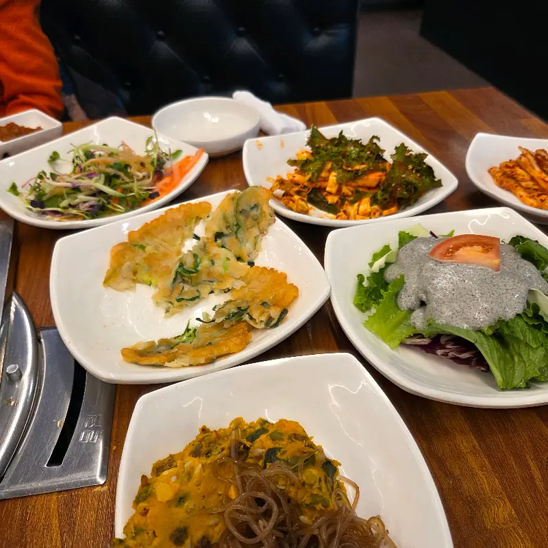 메뉴판을 펼쳐 들었다. 돼지갈비, LA갈비, 한우 갈비살 등 다양한 메뉴들이 있었지만, 나의 선택은 단연 숯불 돼지갈비였다. 2인분을 주문하고, 잠시 후 밑반찬들이 테이블 위를 가득 채웠다.
