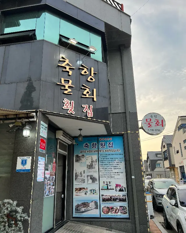 진주에서 맛보는 물회는 어떤 맛일까? 설레는 마음을 안고 축항물회를 향해 발걸음을 옮겼다. 평거동 골목길을 따라 걷다 보니, 저 멀리서부터 ‘축항물회 횟집’이라는 간판이 눈에 들어왔다. 짙은 회색빛 건물 외관에 금색 글씨로 쓰인 상호는, 어딘가 모르게 정직하고 묵직한 인상을 풍겼다. , 에서 보았던 바로 그 모습이었다. 건물 앞에는 메뉴 안내판이 세워져 있었는데, 다양한 물회 종류와 회덮밥, 전복버터구이 등 다채로운 메뉴들이 눈길을 사로잡았다.