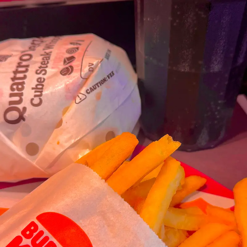 드디어 기다리던 콰트로 치즈 버거 세트가 나왔다. 붉은색 포장지에 감싸인 버거와 노릇노릇한 감자튀김, 그리고 시원한 콜라가 눈 앞에 놓이자 миньон 절로 미소가 지어졌다.