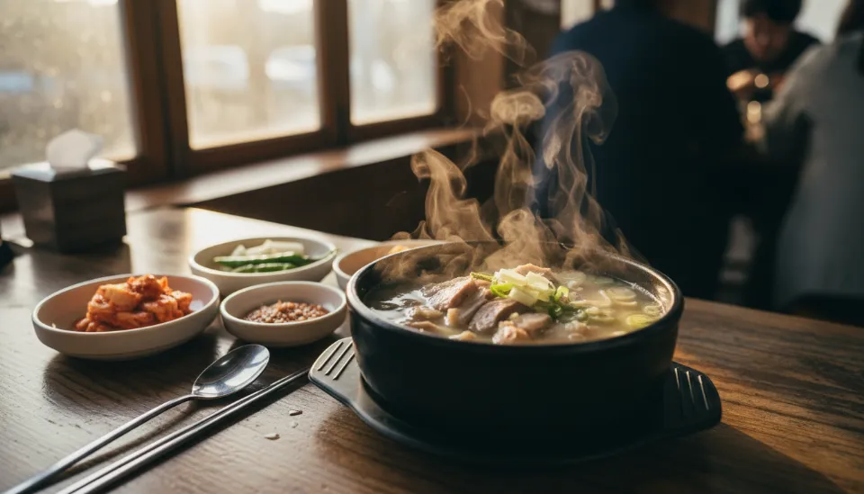 김이 모락모락 나는 진한 국물의 부산 돼지국밥과 신선한 밑반찬들이 테이블에 놓여 있는 정겨운 풍경