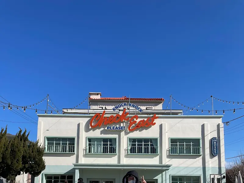 카페에 가까워질수록, 쨍한 민트색감이 눈에 들어오기 시작했다. 마치 영화 속 한 장면처럼, 이국적인 분위기가 물씬 풍기는 외관은 내 기대를 완벽하게 충족시켜주었다. 푸른 하늘 아래, 하얀색 건물과 민트색 창틀이 어우러진 모습은 마치 미국 해변가의 작은 호텔을 연상시켰다. 건물 위에는 “Knock Knock, Check East Please!”라는 네온사인이 반짝이며, 나를 따뜻하게 맞이하는 듯했다.