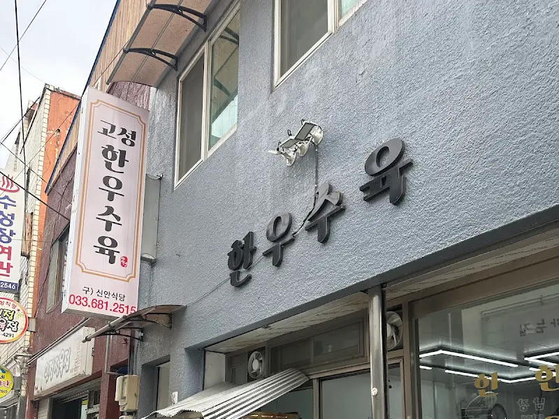 간성시장을 천천히 둘러보며 구경하는 재미도 쏠쏠했습니다. 그러다 마침내, 오늘의 목적지인 ‘고성한우수육’이라는 간판이 눈에 들어왔습니다. 짙은 회색 건물 외벽에 검은색 폰트로 쓰여진 “한우수육” 글자가 왠지 모르게 맛집 포스를 풍겼습니다. 건물에 달린 세로 간판에는 상호와 함께 전화번호가 적혀 있었는데, 왠지 모르게 정겨운 느낌이 들었습니다.