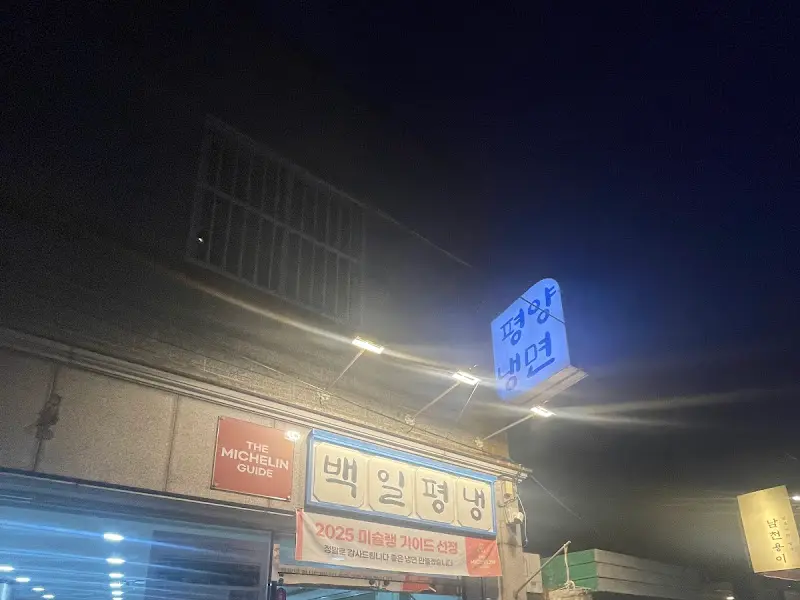 결심이 서자마자, 나는 광안리로 향했다. 푸른 바다를 배경으로 펼쳐진 도시는 활기 넘치는 에너지로 가득했다. 백일평냉을 찾아 걷는 동안, 마음속에는 기대와 설렘이 교차했다. 과연 어떤 맛이 나를 기다리고 있을까? 100일이라는 짧은 시간 동안만 맛볼 수 있다는 희소성은 그 기대감을 더욱 증폭시켰다. 저 멀리, 푸른 간판에 빛나는 ‘평양냉면’ 네 글자가 눈에 들어왔다. 그 옆에는 미슐랭 가이드에 선정되었음을 알리는 붉은 스티커가 자랑스럽게 붙어 있었다.