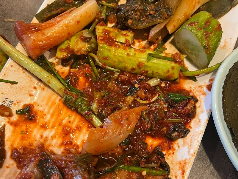 드디어 기다리고 기다리던 김치가 등장했다. 묵은지, 대파김치, 갓김치, 오이소박이, 무김치… 보기만 해도 입안에 침이 고이는 비주얼이었다. 특히 압도적인 크기를 자랑하는 무김치는 그 존재감만으로도 시선을 사로잡았다. 김치 전용 부스가 있을 정도로 김치에 대한 자부심이 남다른 곳이라고 하더니, 정말 그럴 만하다는 생각이 들었다. 사진 속 김치의 붉은 양념은 보기만 해도 군침이 돌게 했다.
