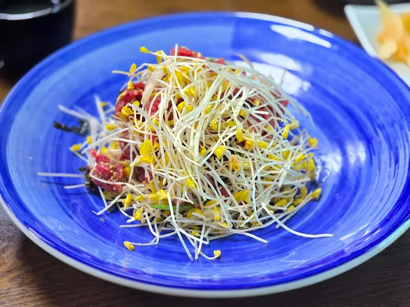 가장 먼저 눈에 들어온 것은 메밀싹 육회였다. 푸른색 접시 위에 소복하게 담긴 육회 위로, 마치 눈처럼 하얀 메밀싹이 덮여 있었다. 붉은 육회와 하얀 메밀싹의 색감 대비가 어찌나 아름다운지, 보는 것만으로도 입안에 침이 고였다. 젓가락으로 살짝 들어 맛을 보니, 부드러운 육회와 아삭아삭한 메밀싹의 조화가 환상적이었다. 육회의 고소함과 메밀싹의 은은한 쌉쌀함이 어우러져, 느끼함은 전혀 없이 입안 가득 신선함만이 감돌았다. 대관령 한우를 사용해서 그런지 육회의 신선함은 정말 남달랐다.