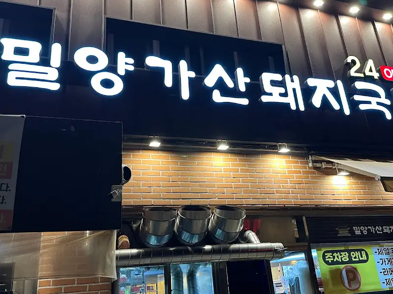 가게 앞을 서성이며 메뉴를 고민하는데, 멀리서도 눈에 띄는 하얀색 네온사인 간판이 시선을 사로잡았다. 큼지막하게 박힌 “밀양가산돼지국밥 24″라는 글자가 왠지 모를 든든함을 안겨주는 듯했다. 벽돌로 마감된 외관은 세월의 흔적을 고스란히 담고 있는 듯했지만, 깔끔하게 정돈된 모습에서 믿음이 갔다.