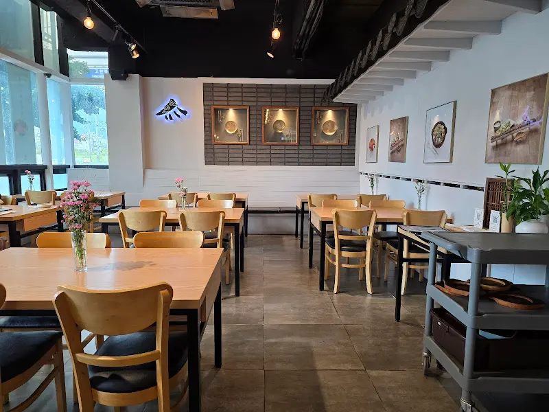 문을 열고 들어서자, 생각보다 훨씬 넓고 깔끔한 공간이 펼쳐졌다. 높은 천장과 은은한 조명 덕분에 편안하고 아늑한 분위기가 감돌았다. 테이블 간 간격도 넉넉해서 옆 테이블 손님들과의 불필요한 접촉 없이 오롯이 식사에 집중할 수 있다는 점이 마음에 들었다. 벽면에는 거북선 로고가 멋스럽게 자리 잡고 있었는데, 거제라는 지역적 특색을 잘 살린 센스 있는 디자인이라고 생각했다. 테이블에 놓인 작은 꽃병에는 보라색 꽃이 꽂혀 있어, 소소하지만 기분 좋은 포인트를 더해주었다.