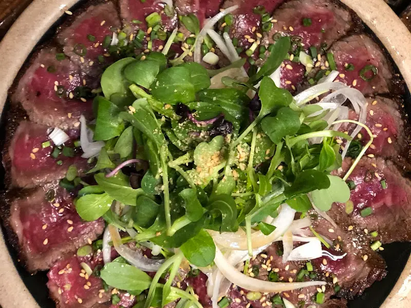 테이블 위에 놓인 한우 타다끼 한 접시
