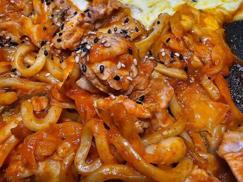 닭갈비만 먹기에는 아쉬워서 우동 사리를 추가했다. 탱글탱글한 우동 면발이 매콤한 양념과 어우러져, 또 다른 즐거움을 선사했다. 면발에 양념이 쏙 배어들어, 젓가락을 멈출 수 없었다. 우동 사리는 닭갈비의 매콤함을 중화시켜주면서도, 풍성한 식감을 더해주어 만족스러웠다. 에서 보이는 것처럼, 윤기 흐르는 닭갈비와 우동 사리의 조합은 정말 최고였다.