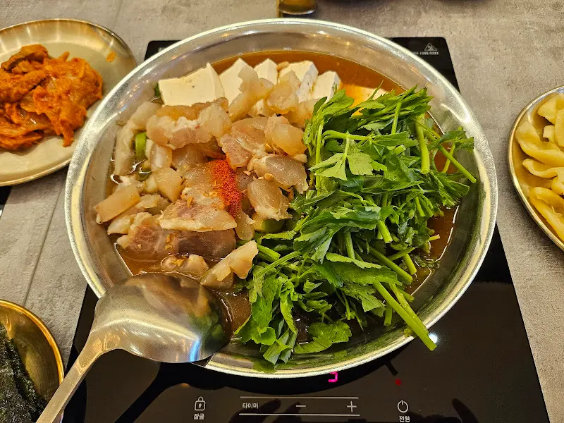 육안으로도 신선함이 느껴지는 푸짐한 야채와 쫄깃한 스지가 듬뿍 올려진 모습은 그야말로 압도적이었다. 인덕션 위에 올려진 전골은 지글지글 소리를 내며 끓기 시작했고, 나는 황홀경에 빠져들었다.