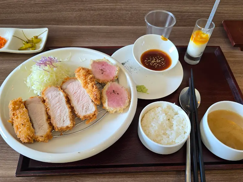 특히 인상적이었던 점은 돈까스의 굽기 정도였다. 사진에서 볼 수 있듯이, 겉은 완벽하게 튀겨져 바삭한 식감을 자랑했지만, 속은 마치 레어 스테이크처럼 촉촉하고 부드러웠다. 저온 조리 방식으로 익혔다는 설명처럼, 겉과 속의 조화가 환상적이었다. 젓가락으로 살짝 집어 올리자, 육즙이 은은하게 배어 나오는 모습은 보는 이의 식욕을 자극하기에 충분했다.