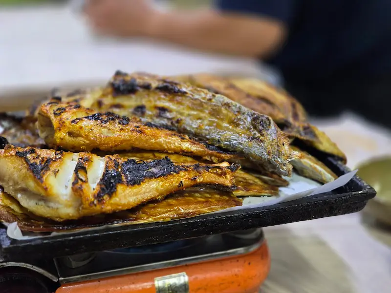 뜨겁게 달궈진 철판 위에 다섯 종류의 생선이 나란히 놓여 있었다. 고등어, 꽁치, 갈치, 조기, 그리고 이름 모를 또 다른 생선 한 마리. 겉은 바삭하고 속은 촉촉하게 구워진 생선들은 윤기가 자르르 흘렀다. 특히 껍질 부분은 군데군데 노릇하게 탄 흔적이 있어 더욱 먹음직스러워 보였다.
