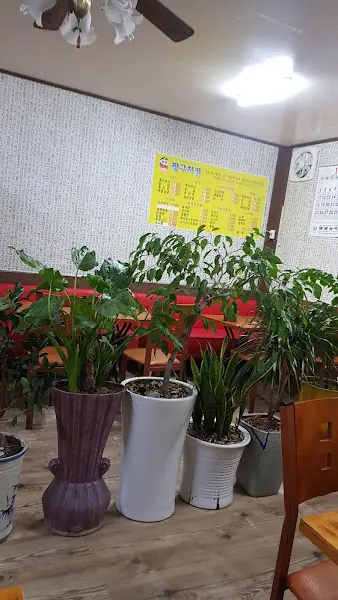 소박하지만 정겨운 분위기의 내부 인테리어. 테이블 옆 화분들이 편안함을 더한다.