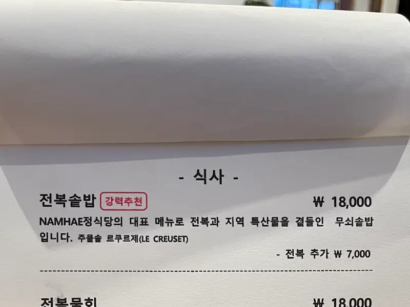 자리에 앉아 메뉴판을 펼쳐 보았다. 에서 보았던 메뉴판에는 전복솥밥과 전복물회가 가장 먼저 눈에 띄었다. 특히 ‘강력추천’이라고 적힌 전복솥밥은 꼭 먹어봐야 할 것 같았다. 남해까지 왔으니, 신선한 해산물을 맛보는 것은 당연지사. 잠시 고민 끝에 전복솥밥과 전복물회를 주문했다.