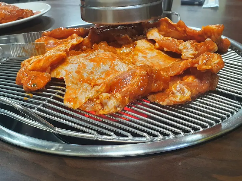 사진 속 닭갈비는 붉은빛 양념에 촉촉하게 잠겨 있어, 보기만 해도 입안에 침이 고이게 한다. 숯불 위에 올려진 닭갈비는 연기를 내뿜으며 맛있게 익어가고, 그릴 자국은 먹음직스러움을 더한다. 특히 클로즈업된 사진에서는 닭갈비의 윤기와 질감이 생생하게 느껴져 더욱 식욕을 자극한다. 함께 제공되는 밑반찬들은 깔끔하고 정갈하게 담겨 있어, 음식에 대한 신뢰감을 준다.