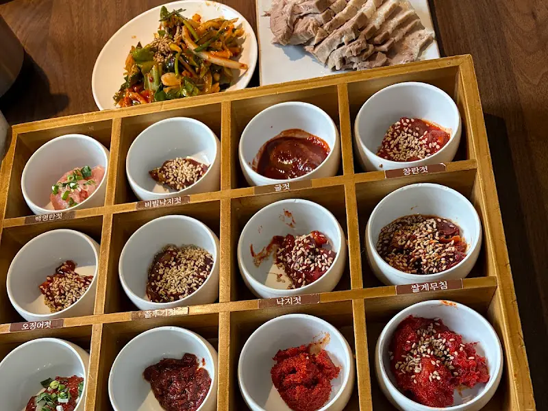 젓갈 트레이를 자세히 살펴보니, 각각의 젓갈 이름이 적혀 있었다. 갈치젓, 꼴뚜기젓, 창란젓 등 익숙한 이름도 있었지만, 백명란젓, 어리굴젓 등 평소에 접하기 어려웠던 젓갈도 눈에 띄었다. 젓갈 위에는 тонкий белый кунжут 뿌려져 있어, Корея деликатесы 식욕을 더욱 자극했다. 젓갈을 하나씩 맛보며, 그 다채로운 풍미에 감탄했다. 짭짤하면서도 감칠맛 도는 젓갈은 갓 지은 따뜻한 밥과 환상적인 조화를 이루었다. 특히 꼬득꼬득한 식감이 매력적인 창란젓과 부드러운 백명란젓은 잊을 수 없는 맛이었다. 을 보면, 젓갈 종류가 다양하고 정갈하게 담겨 나온 모습이 더욱 실감 난다.