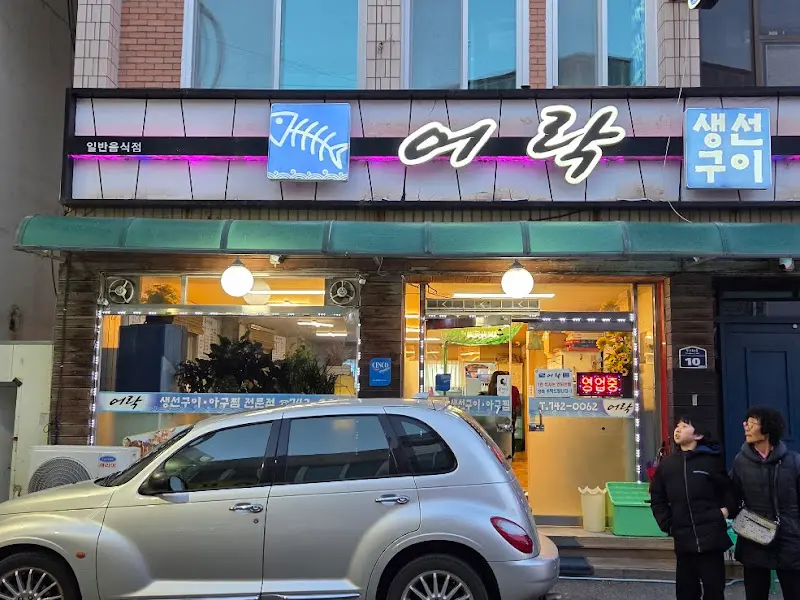 * : 식당 외부 모습으로, 파란색 간판에 “어락”이라는 글자와 물고기 그림이 그려져 있다. 정겨운 분위기가 느껴진다.