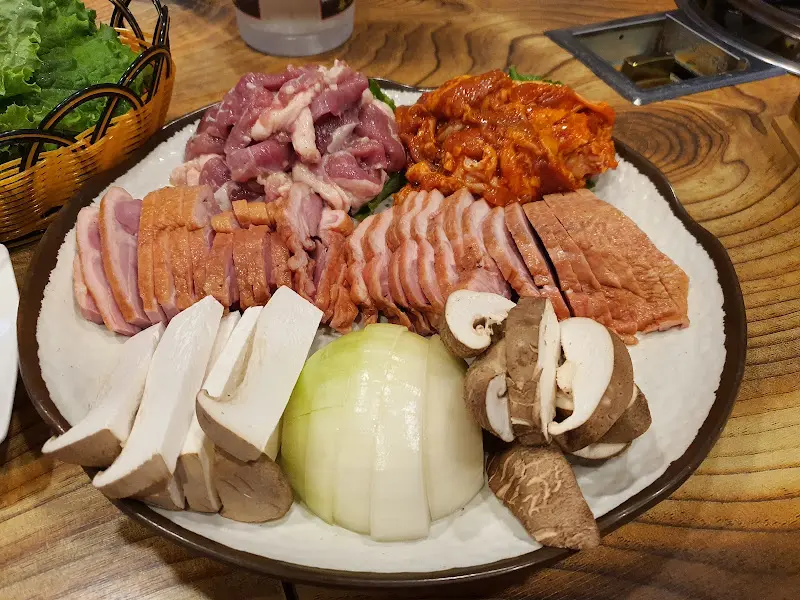 드디어 기다리고 기다리던 모듬 스페셜이 등장했다. 큼지막한 접시 위에 훈제, 로스, 주물럭이 보기 좋게 담겨 나왔다. 뽀얀 속살을 드러낸 오리 로스와 윤기가 좌르르 흐르는 훈제, 그리고 매콤한 양념에 버무려진 주물럭의 조화가 환상적이었다. 버섯과 양파, 마늘도 넉넉하게 함께 제공되어 푸짐함을 더했다. 마치 팔공산의 풍요로움을 그대로 담아낸 듯한 비주얼이었다.