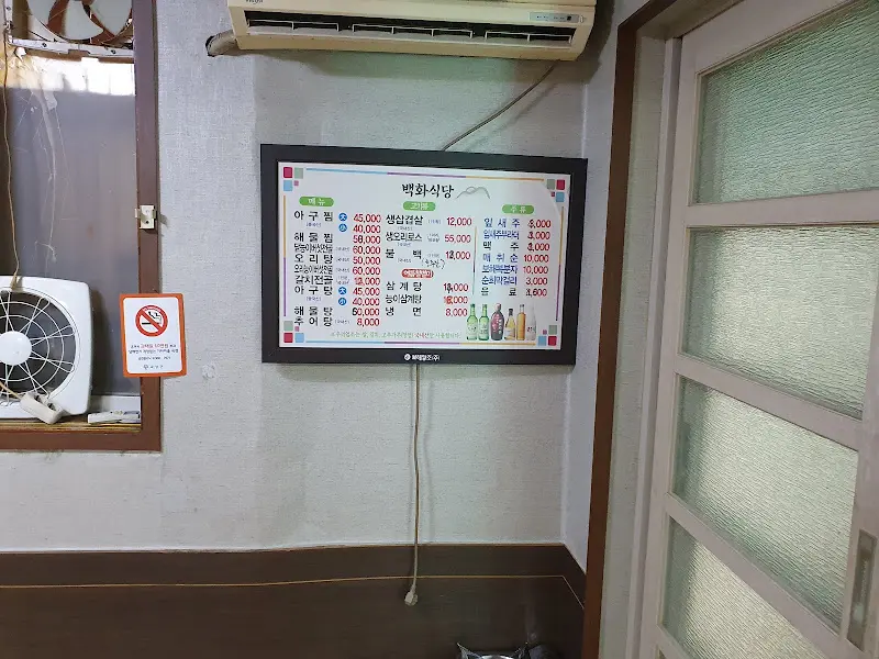 벽 한쪽에 걸린 메뉴판은 마치 오래된 영화 포스터처럼 낡았지만, 그 안에 담긴 메뉴들은 하나하나 정성스럽게 쓰여 있었다. 어머님이 하시던 시절부터 3대째 며느님이 이어오고 있다는 이야기가 떠올랐다. 메뉴판 옆에는 작은 선풍기가 돌아가고 있었는데, 그 모습조차도 정겹게 느껴졌다. 메뉴판에는 아구찜, 닭볶음탕, 생삼겹살 등 다양한 메뉴가 있었지만, 나는 망설임 없이 백화식당의 대표 메뉴인 아구찜을 주문했다. 왠지 모르게 이곳에서는 아구찜을 먹어야만 제대로 된 경험을 할 수 있을 것 같았다.