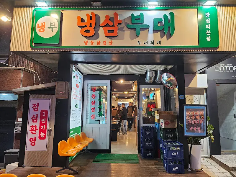 퇴근 후, 텅 빈 속을 달래줄 무언가를 찾아 왕십리 골목을 헤매던 중, 유독 눈길을 사로잡는 곳이 있었다. 촌스러운 듯 정겨운 초록색 간판에 큼지막하게 쓰인 “냉삼부대”라는 이름. 왠지 모르게 발길이 이끌려 문을 열었다.