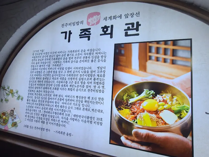전주에 발을 디딘 순간, 마치 시간 여행이라도 시작된 듯 고즈넉한 풍경이 눈 앞에 펼쳐졌다. 한옥 지붕들이 옹기종기 모여 있는 모습은 그 자체로 한 폭의 그림이었다. 이번 여행의 목적은 단 하나, 전주가 자랑하는 전통의 맛, 비빔밥을 제대로 느껴보는 것이었다. 수많은 비빔밥집 중에서 나의 선택은 65년의 역사를 자랑하는 “가족회관”이었다. 2대째 이어져 오는 손맛은 과연 어떤 감동을 선사할까? 설레는 마음을 안고 한옥마을 골목길을 걸어 “가족회관”으로 향했다.