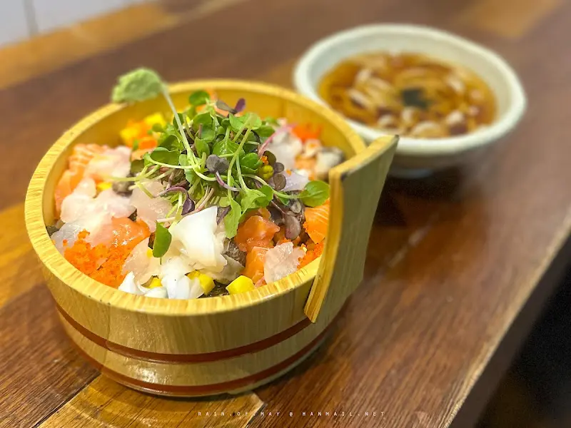 주문 후 얼마 지나지 않아, 기다리고 기다리던 ‘흐트러진 덮밥’이 먼저 나왔다. 나무로 만든 독특한 그릇에 담겨 나온 덮밥은, 마치 예술 작품을 보는 듯한 비주얼을 자랑했다. 잘게 썰린 연어, 광어, 문어, 계란, 날치알 등이 형형색색으로 흩뿌려져 있었고, 그 위에는 신선한 채소가 듬뿍 올려져 있었다.