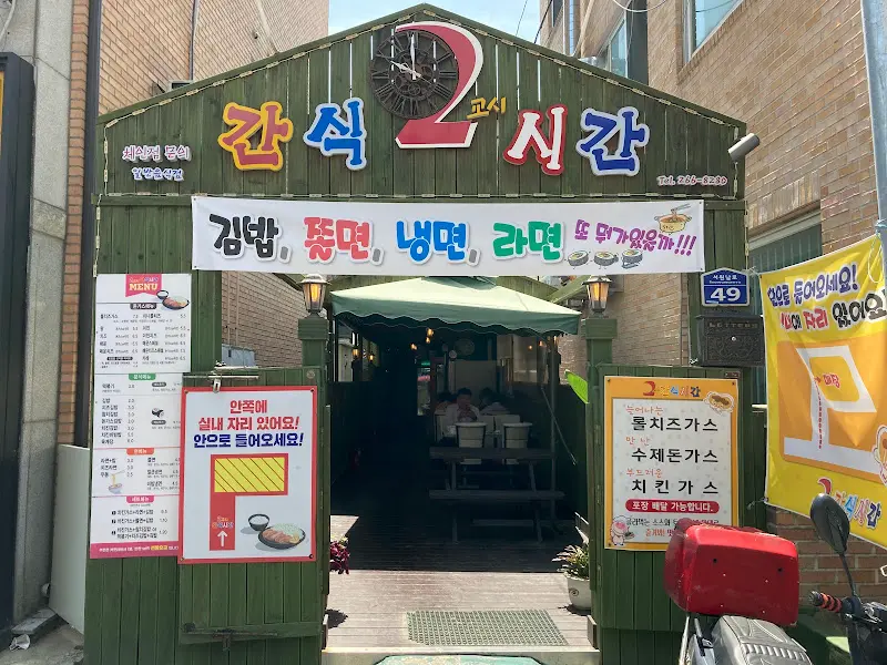 이미지들을 살펴보면, 간식2교시는 세월의 흔적이 느껴지는 곳이다. 하지만 낡은 모습 속에서도 따뜻함과 정겨움이 느껴진다. 녹색으로 칠해진 나무 외관은 마치 숲 속의 작은 집 같은 느낌을 준다. 내부는 아늑하고 편안한 분위기이며, 벽에는 손님들이 남긴 낙서와 메시지들이 가득하다. 음식 사진들을 보면, 돈까스와 쫄면은 푸짐하고 맛있어 보인다. 특히 돈까스 위에 뿌려진 깨와 소스는 식욕을 자극한다.