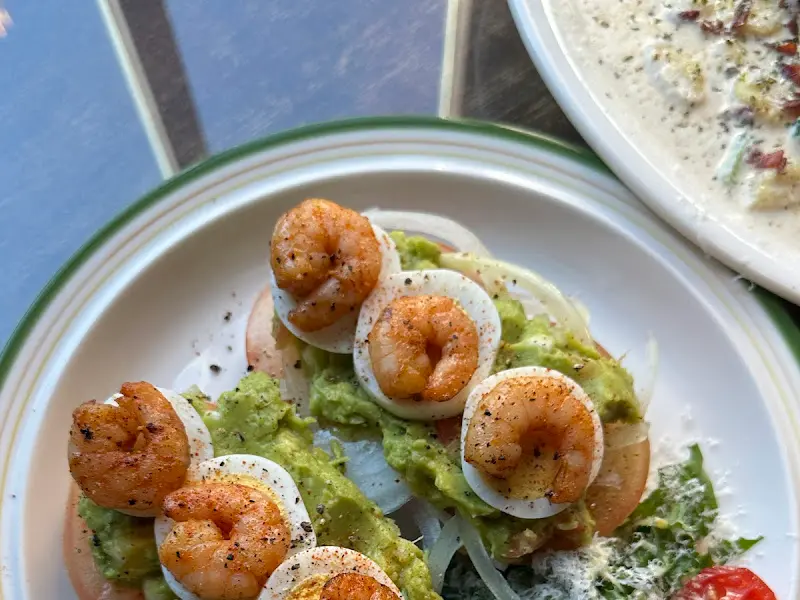 마지막으로 오픈 샌드위치를 맛보았다. 를 보면 알 수 있듯이, 신선한 채소와 새우, 그리고 반숙 계란이 듬뿍 올려져 있었다. 빵 위에 아보카도 소스를 바르고, 그 위에 다양한 재료들을 올려 만든 오픈 샌드위치는 식감이 다채로웠다. 특히, 새우는 탱글탱글했고, 반숙 계란은 부드러웠다. 샌드위치에 사용된 빵은 바삭하게 구워져서 씹을 때마다 고소한 풍미가 느껴졌다. 은 오픈 샌드위치의 클로즈업 샷인데, 재료들의 신선함이 그대로 느껴진다.