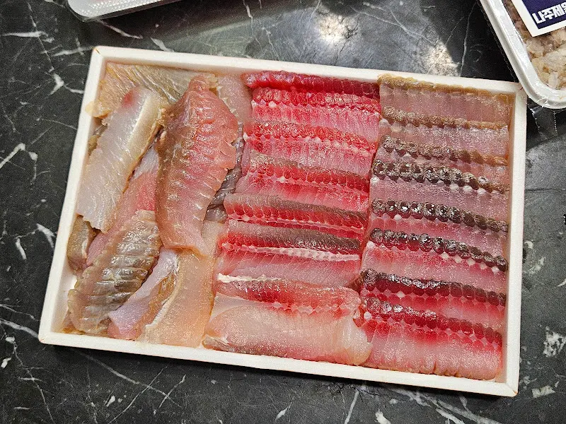 집으로 돌아오는 차 안, 은은하게 퍼지는 홍어 향에 더욱 기대감이 증폭되었다. 마치 보물 상자를 들고 가는 듯한 기분이었다. 집에 도착하자마자 포장 박스를 열어보니, 신선한 홍어회가 가지런히 담겨 있었다. 붉은 빛깔과 투명한 흰색이 조화롭게 어우러진 모습이 정말 먹음직스러웠다. 사진에서 보듯, 홍어의 다양한 부위가 가지런히 놓여 있어 시각적인 즐거움까지 더했다.